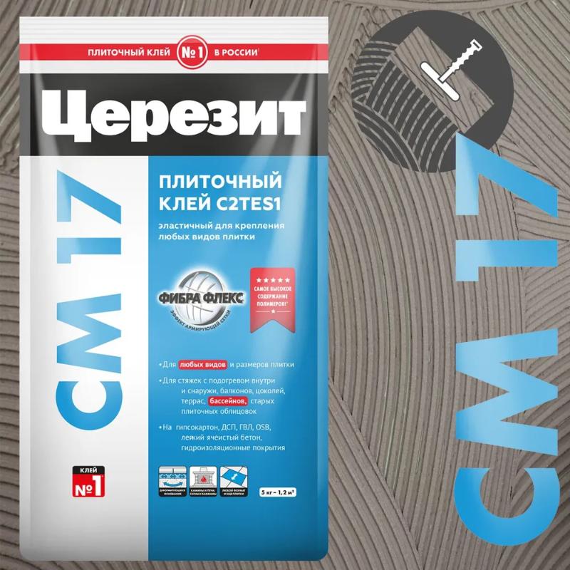 Клей СМ 17 Super Flex предназначен для крепления всех видов минеральных плиток — керамических, керамогранитных, клинкерных, каменных (кроме мраморных) и т.п., на стенах и полах внутри и снаружи зданий, преимущественно на сложных и деформирующихся основаниях и элементах конструкций.