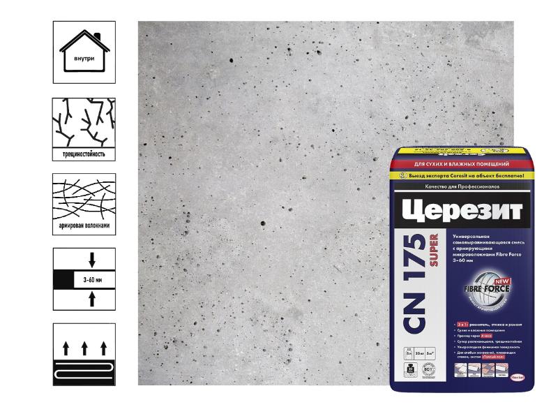 Самовыравнивающаяся смесь CN 175 предназначена для выравнивания бетонных, цементно-песчаных, ангидритных и гипсовых оснований пола под укладку напольных покрытий (керамических плиток, линолеума, ковролина, ламината и т.п.) в помещениях с сухим и нормальным влажностными режимами, и невысокими механическими нагрузками (жилых, бытовых, административных и т.п.).