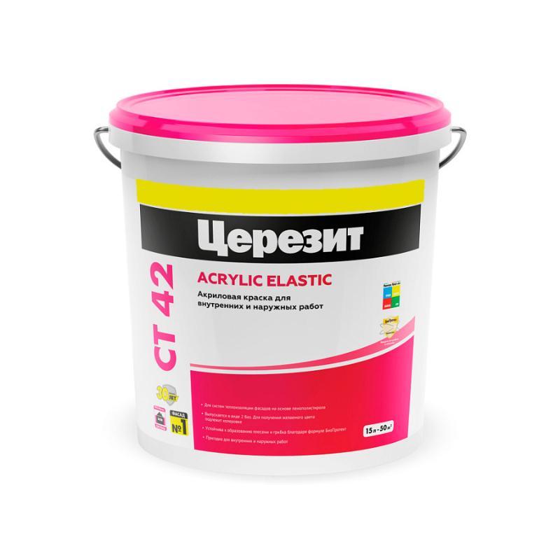 Акриловая краска CT 42 предназначена для окрашивания минеральных и акриловых декоративных штукатурных покрытий, таких как CT 35, CT 137, CT 60, CT 63 и CT 64, а также бетона, цементно-песчаных, цементно-известковых и известковых штукатурок, как внутри, так и снаружи зданий. Ceresit CT 42 (Церезит CT 42) - краска на воднодисперсионнойоснове, предназначенная для проведения работ как внутри, так и снаружи помещения.